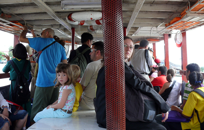 上の左側の写真がティアン船着場と渡し船(1人片道2バーツ)。