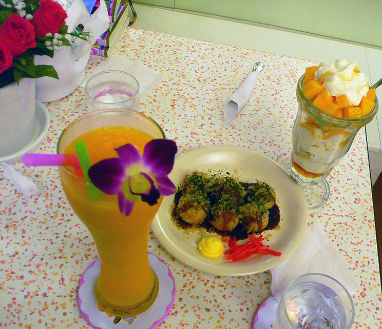 『萌え萌えマンゴーパフェ』と、焼き鳥・たこ焼き・マンゴーシェイクを注文。