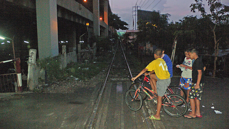 さらに進むと踏切があり、そこで子供達が自転車の改造中。