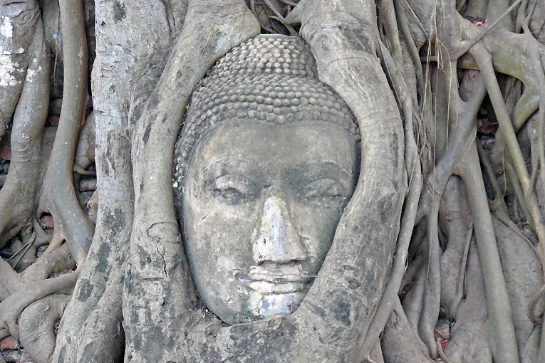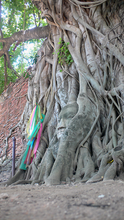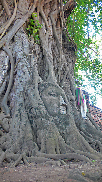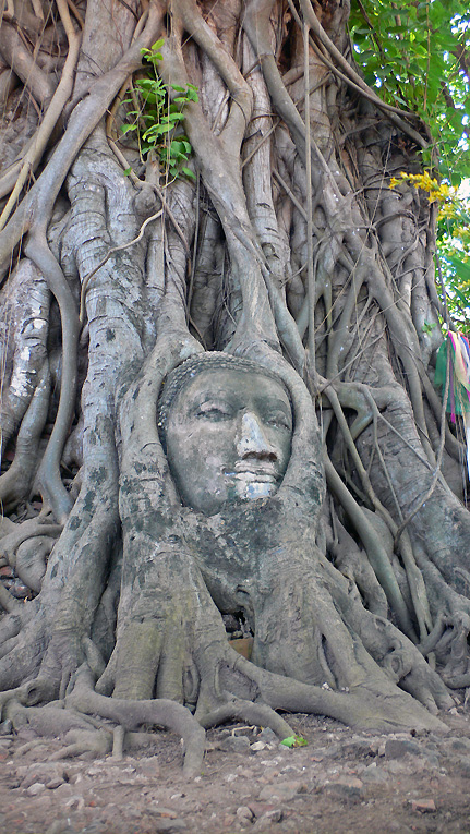 長い年月を経て木の根に覆われた仏頭は、今では世界中の人々を