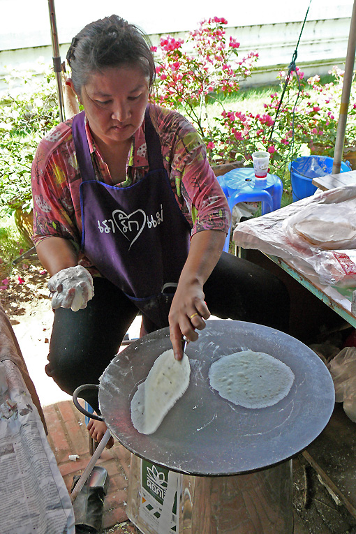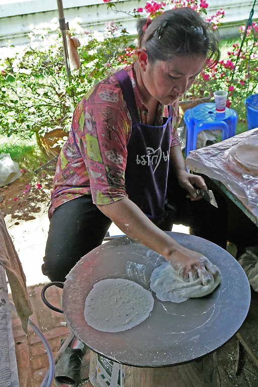 上の写真は、寺院の隣にあるお土産コーナーにいたお菓子を焼く女性の様子です。