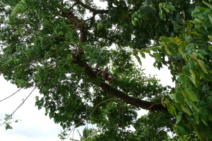 舟に乗ってふと上を見ると、少年が2人木に上ってい涼んでいました。